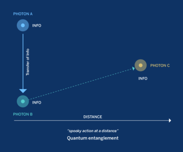These particles, according to the Quantum Theory, are able to exist in a way humans never have: existing in multiple places at a time. There are two key concepts that allow this to happen. Firstly ,the entanglement of subatomic particles is when two particles become connected, and remain connected in action even when they are apart. For example, if one particle moves to the right, the other does at the same time due to their connection.