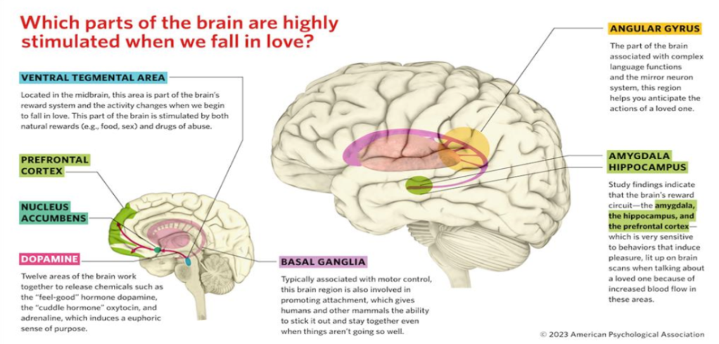 A psychologist at the University of Chicago, Stephanie Cacioppo, who studied the neuroscience of romantic love for the past decade, explained in reasoning that much of the causes in the brain come from changes in the brain’s reward system. Two active regions of the brain— the ventral tegmental area (VTA) and caudate nucleus, are shown to be the main reason why this system is triggered. When the idea of falling in love makes a person feel good, supposedly the brain will react and these two regions will regulate a feeling or attachment in the brain called “neurotransmitter dopamine.” Known for their part in chemicals released by neurons in the brain, most of why they are active is actually because of the brain’s response to stimuli, or signals of the person. Having many forms of neurotransmitters in one’s body, a common one is dopamine, which acts as an organic amine that will send signals to the other nerve cells when in response to the feeling of doing something enjoyable that brings pleasure to the body