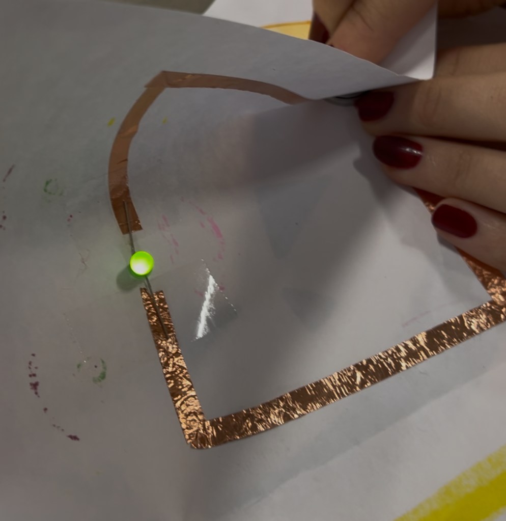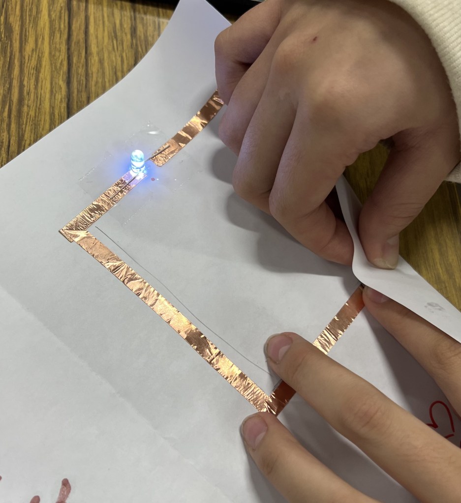 Students make light up circuit cards using copper tape, an LED light, and a battery.